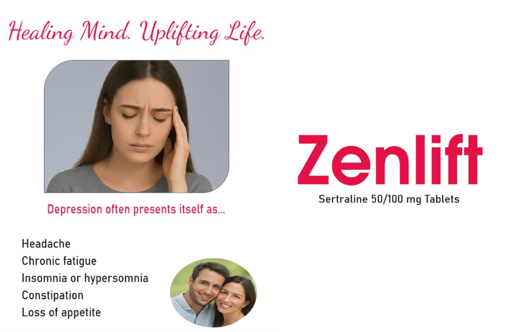 Antidepressant tablet containing Sertraline 50mg / 100mg, used to treat depression, anxiety, and related mood disorders effectively.